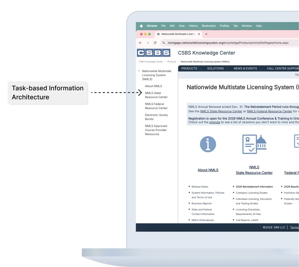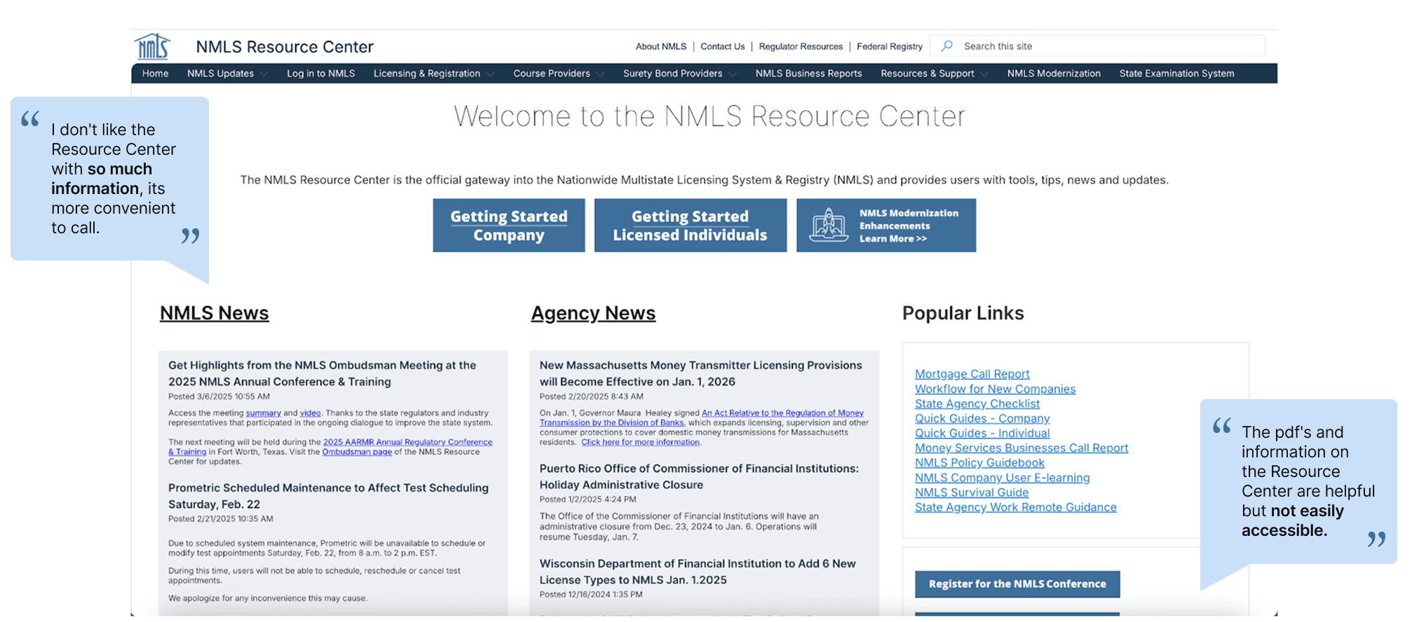 The redesigned NMLS Resource Center directly addresses key pain points from our research: confusing navigation, information overload, and content that previously catered only to large companies.