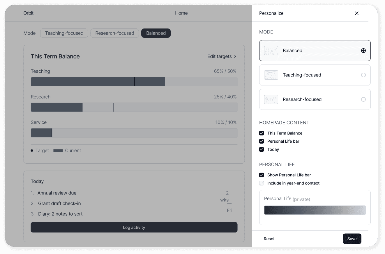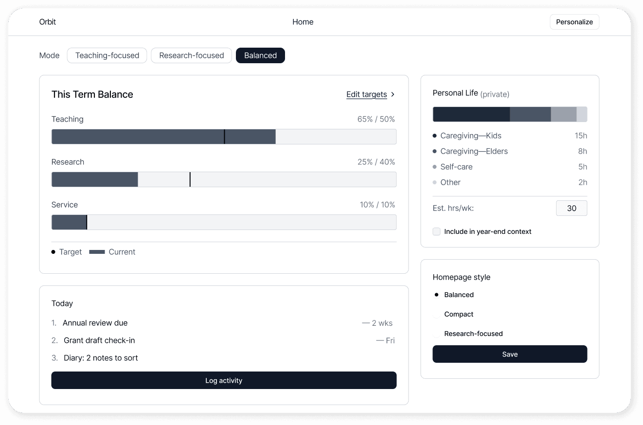 A configurable landing page adapts to the faculty member’s stated preferences. They can choose to include personal life as an element in the dashboard to discuss during year-end reviews.