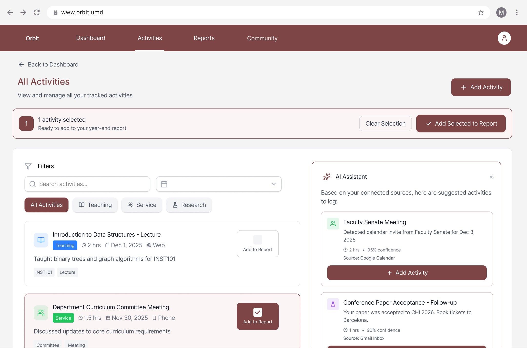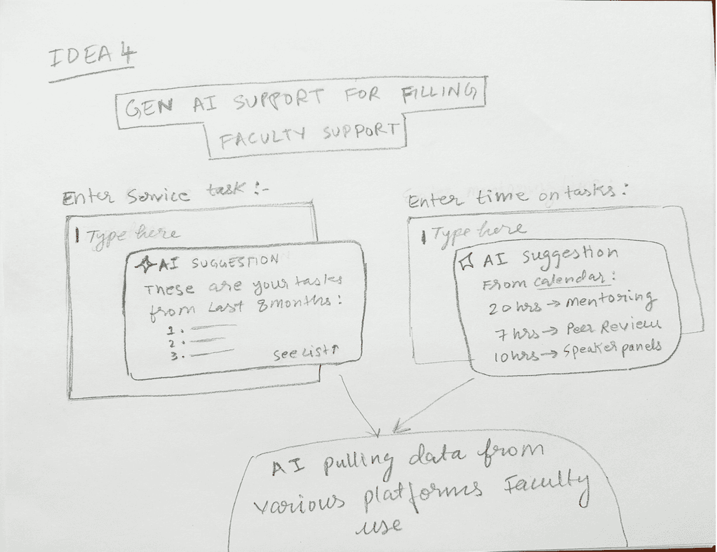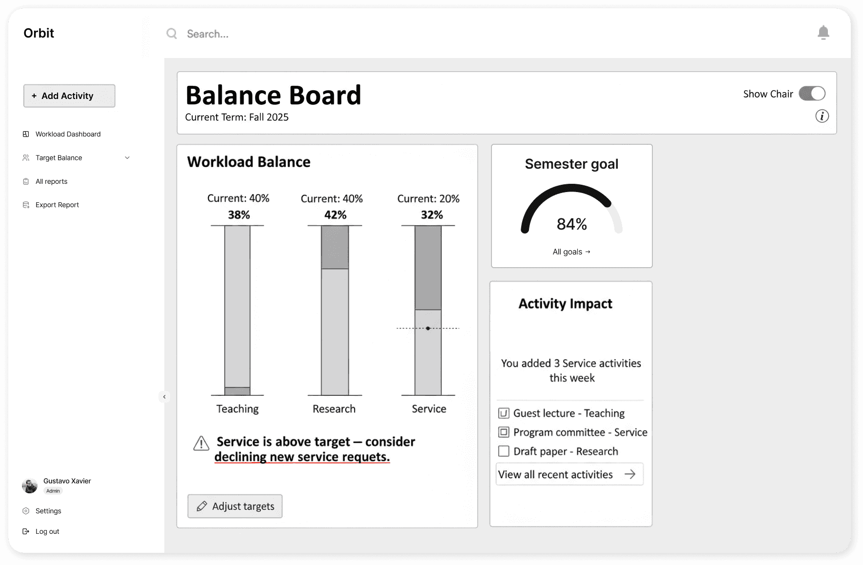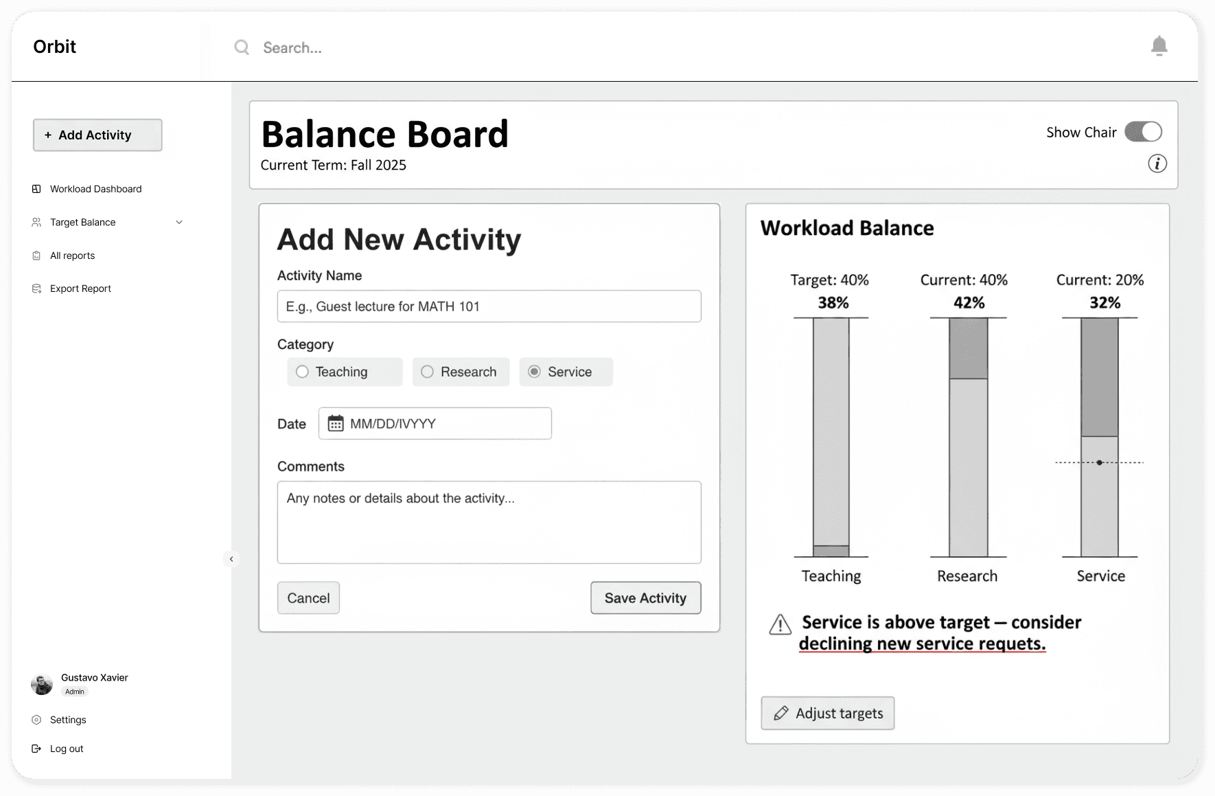 We designed a web-based tool that helps faculty track their workload, understand when to say yes to new commitments, and better balance teaching, service, and research. The platform streamlines previously manual tasks through AI-assisted activity logging and generates an editable, AI-powered year-end report.