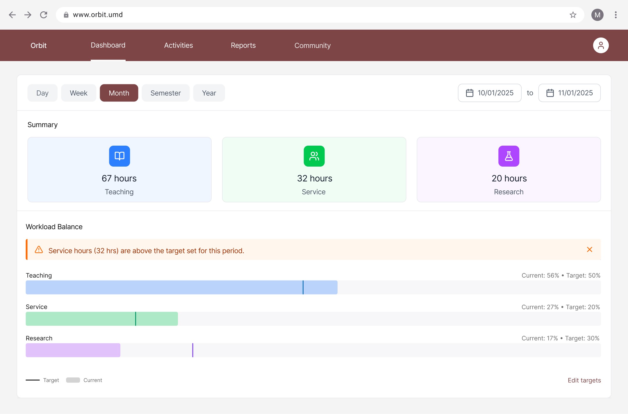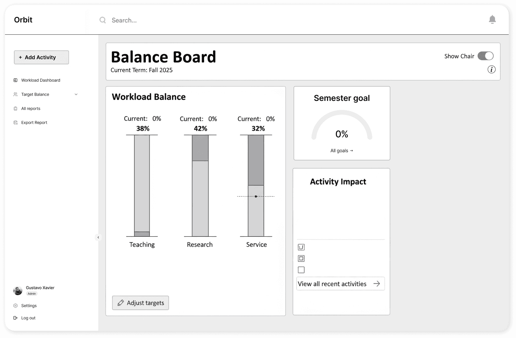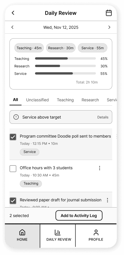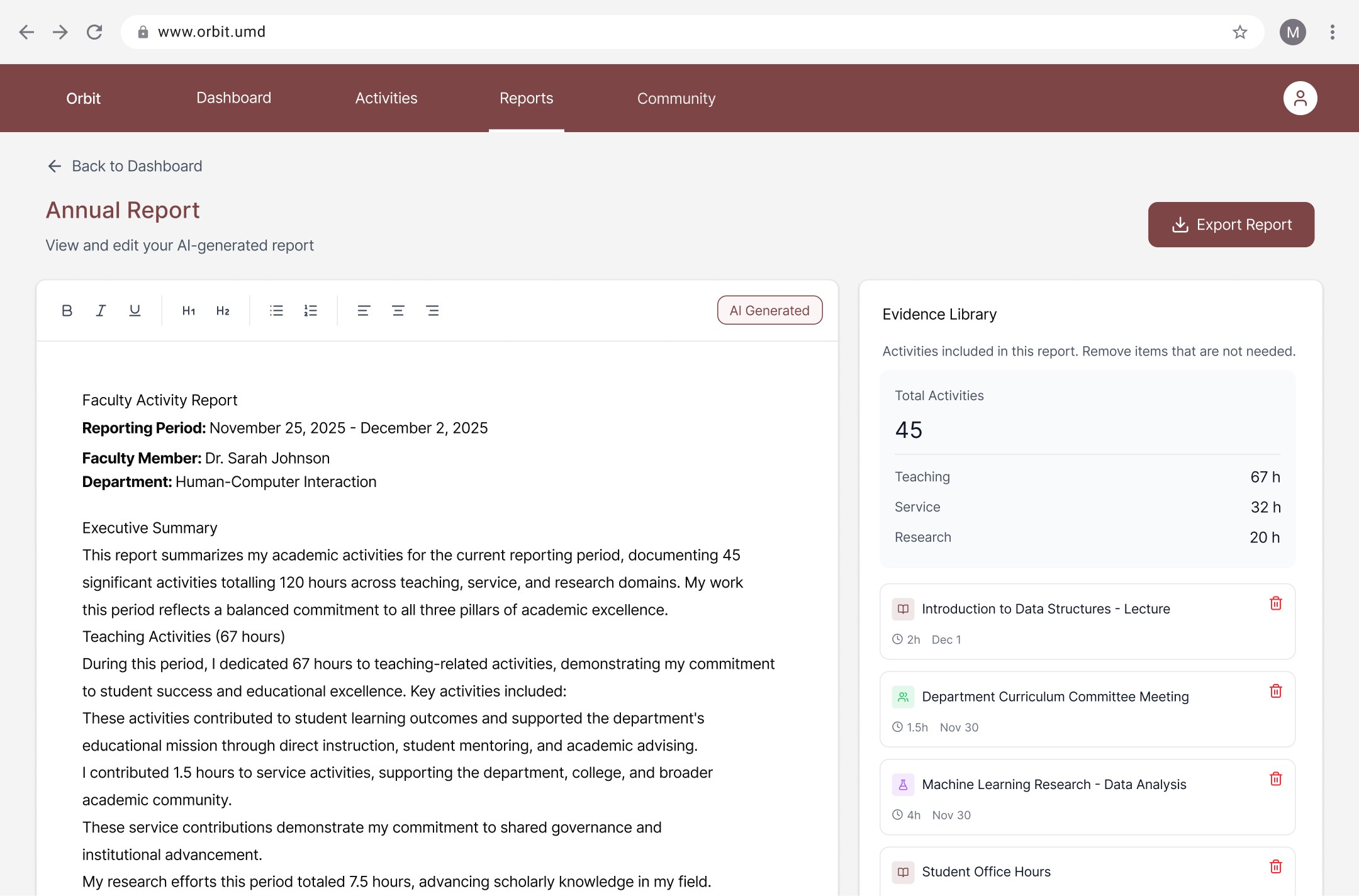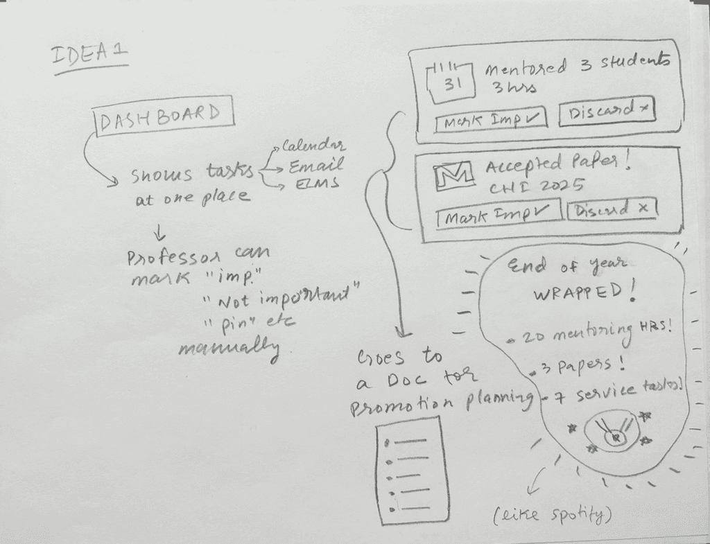 We designed a web-based tool that helps faculty track their workload, understand when to say yes to new commitments, and better balance teaching, service, and research. The platform streamlines previously manual tasks through AI-assisted activity logging and generates an editable, AI-powered year-end report.