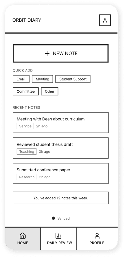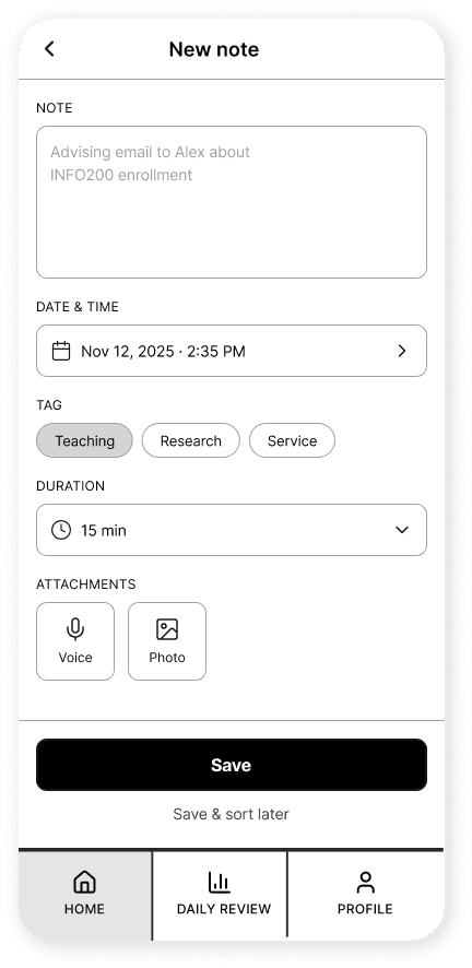 A “diary” widget lets faculty jot quick notes about fragmented tasks (advising emails, committee work) throughout the day to make them easier to document for year-end reviews.