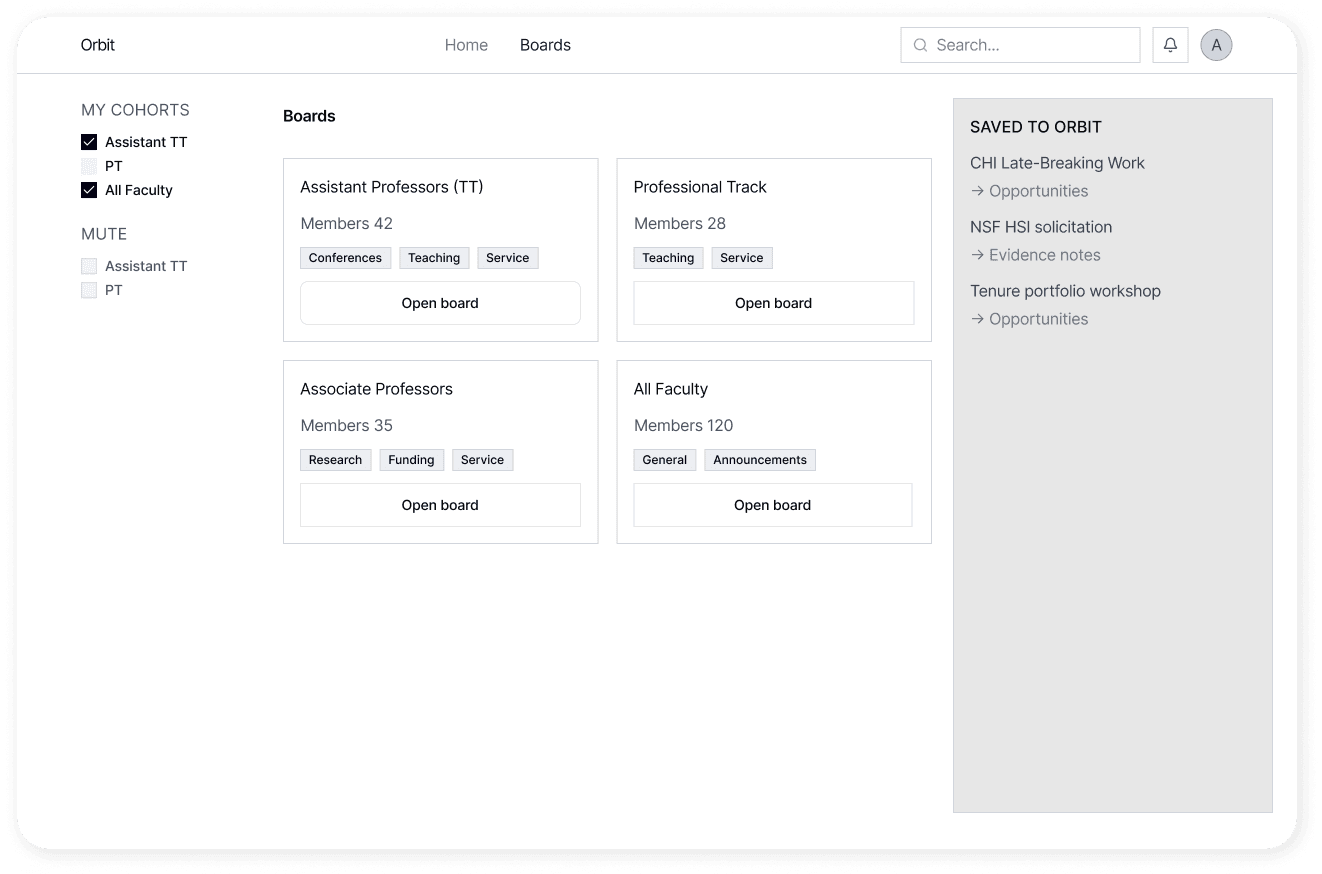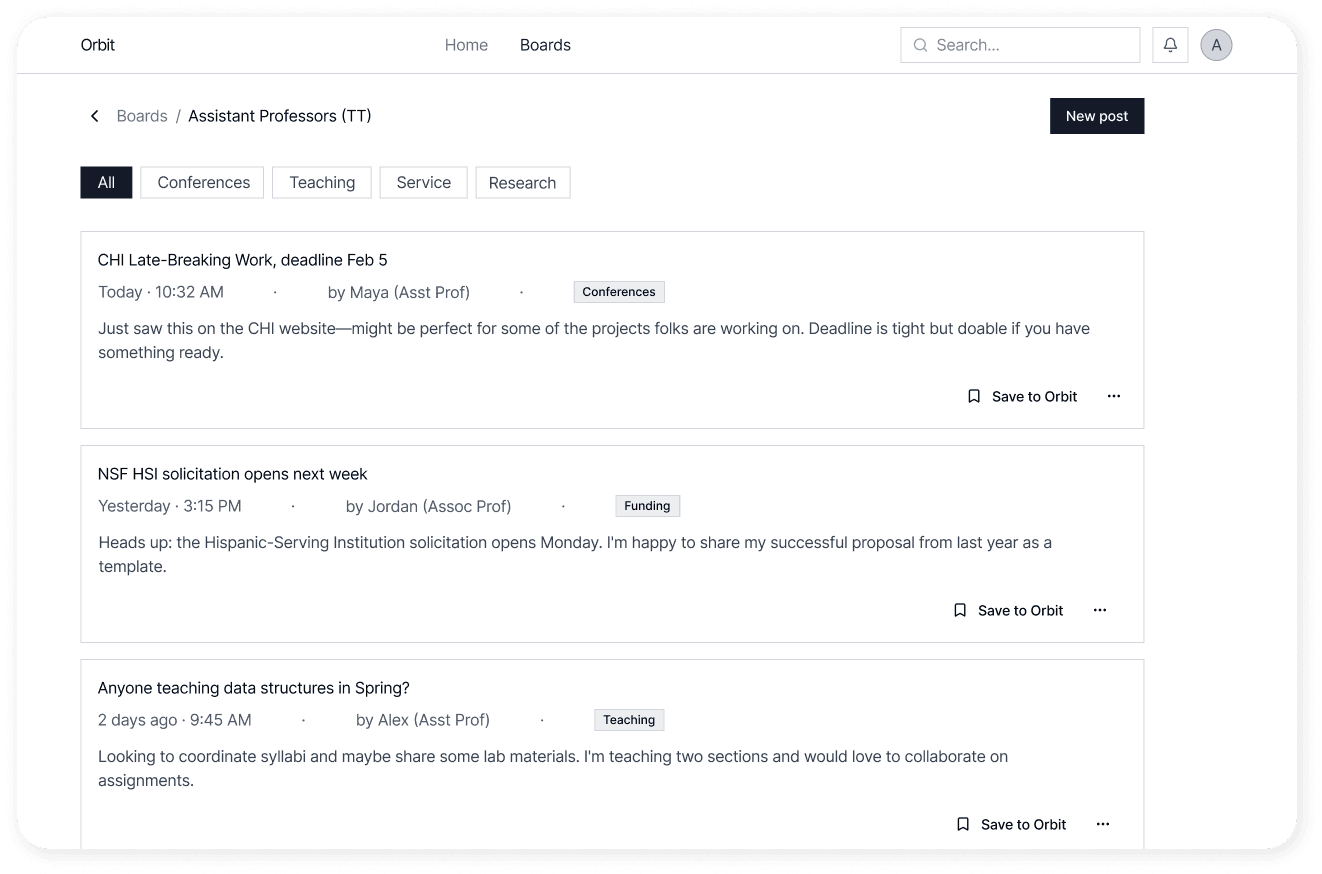 The system gives faculty a lightweight place to share timely, career-relevant content (conferences, teaching hacks, service opportunities) with peers in similar roles.