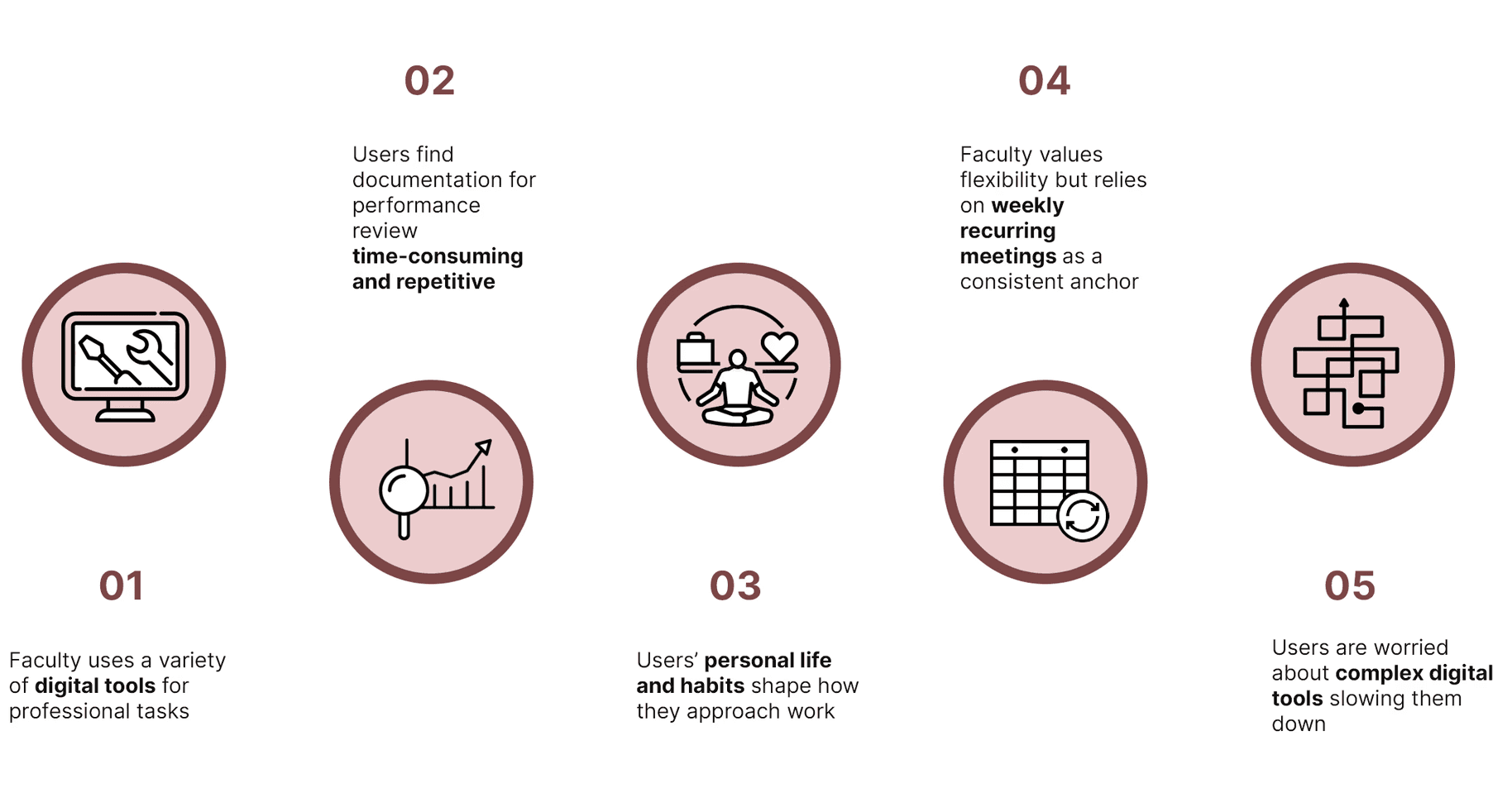 During the research phase, I led three interviews and 2 participatory design sessions with faculty members to better understand their workload management and promotion planning strategies.