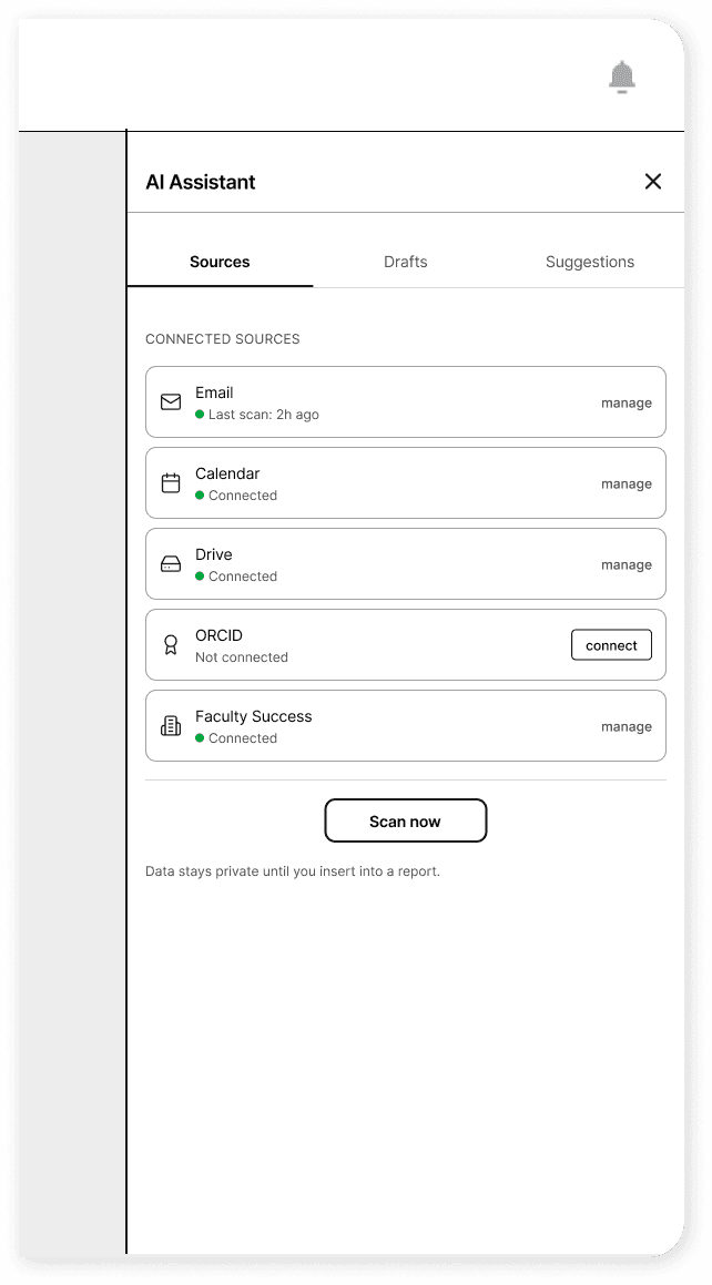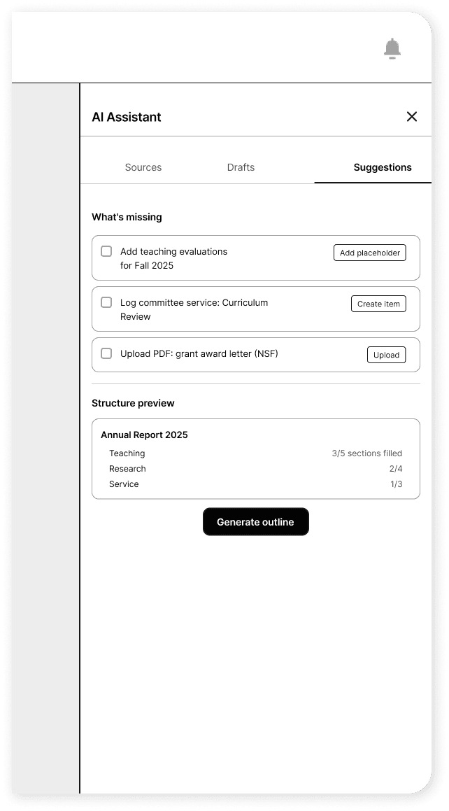An AI side-panel feature on Orbit that pulls data from various platforms used by faculty and drafts evidence statements, structures accomplishments, and suggests missing items.